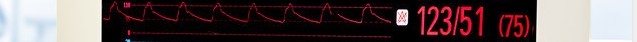 第一张图中的第三行红色部分,包括两部分,前面的波形和后面的数字,血压测量对于大众来说就比较熟悉了,血压测量可以通过无创方法和优创方法,有创血压监测通过穿刺针进入动脉血管(通常是手腕处桡动脉),通过传感器,就能够测量出波形和压力值,这种测量方法准确性最高,实时测量,在ICU常用,如果在普通病房就没有左侧这个红色的波形了,只会有右侧这个数值,这是通过手臂处的袖带测量的,也就是我们最常见的血压测量方法,他不是持续监测,间断的袖带松紧进行测量,测量频率可以通过机器设置调节,比如每1小时、2小时、3小时等,也可以随时手动按键测量。患者家属要关注什么?右边的数字!正常血压记录收缩压(高压)和舒张压(低压),如120/75mmHg,正常收缩压在90-120mmHg,高于140mmHg为高血压,低于90mmHg为低压,超出这个范围就要预警了,要询问医生护士进行处理;舒张压正常在60-90mmHg。