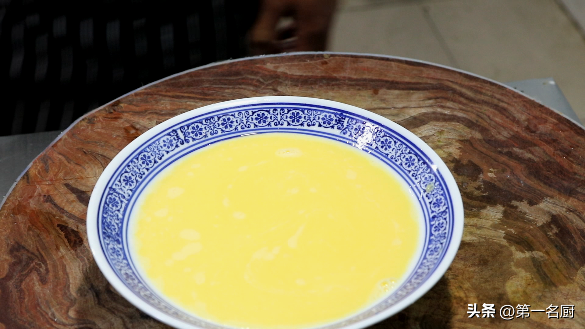 3.锅中提前烧水,在这个时间,取一个小盆,打入4到5个鸡蛋,添入适量的清水,鸡蛋与水的比例大约是1比1.5,加入食盐,鸡粉各1克,用筷子搅拌均匀,用漏勺滤出蛋液里面的泡沫,倒入一个大碗中。